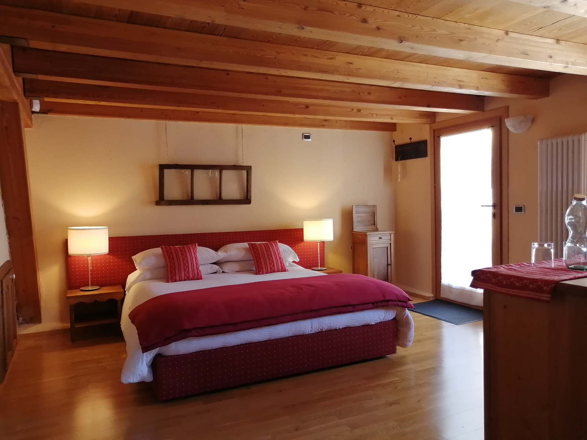 Suggestive double room characterized by the red colour. It is the ideal environment for those who love an elegant and characteristic solution at the same time.